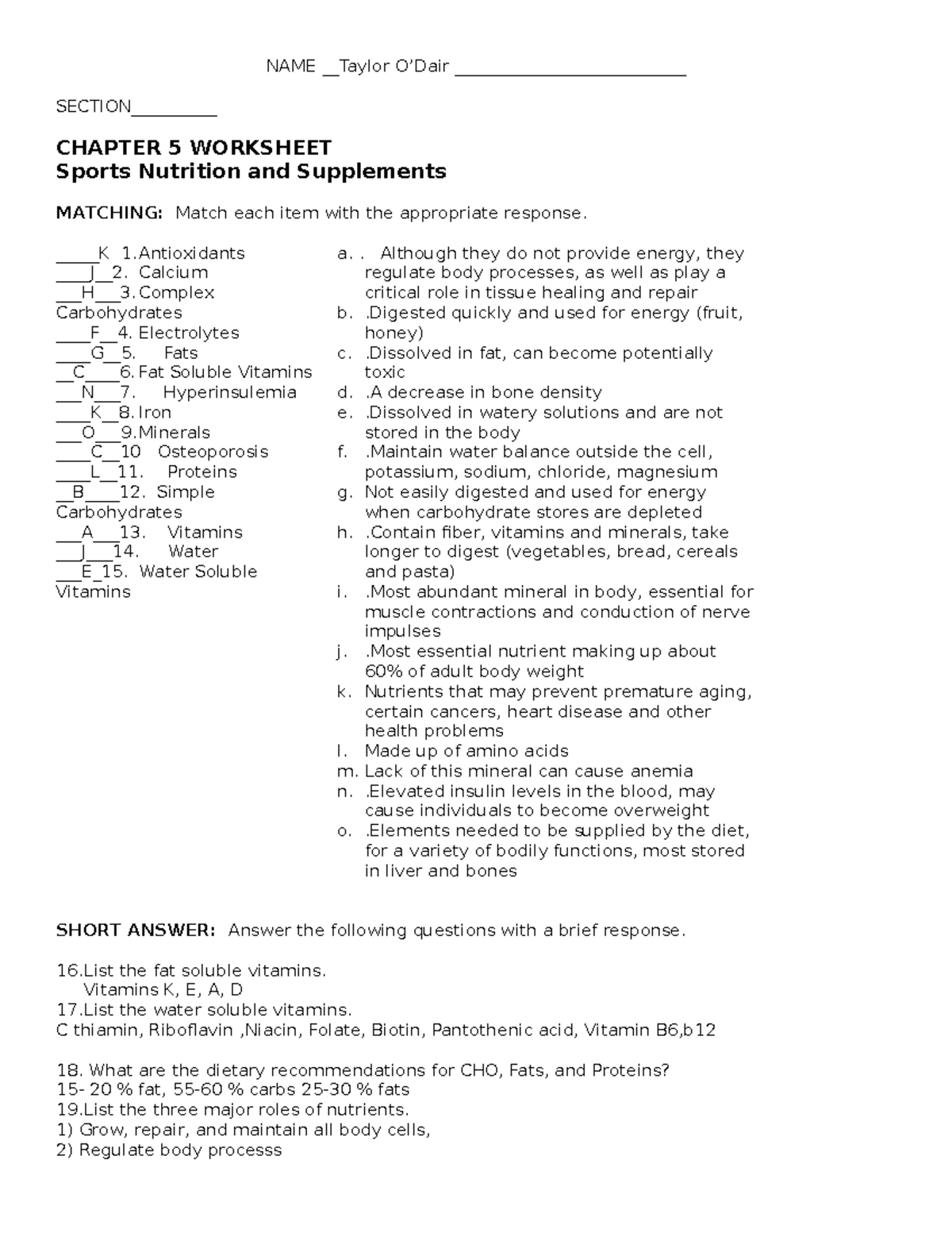 Chapter 5 Worksheet Docx Chapter 5 Worksheet Nutritional Considerations Matching Match The Following Vitamins With The Appropriate Response 1 Course Hero